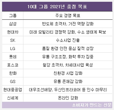 삼성과 포스코는 주력인 반도체와 철강사업의 초격차 전략을 이어가 포스트 코로나 시대를 대비한다. 현대자동차와 SK, 한화 등은 친환경 사업에서 그룹의 미래 초석을 다진다.