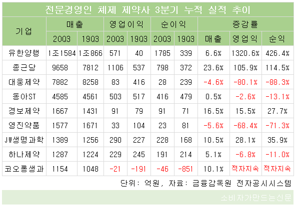 영진약품의 지난해 3분기 누적 매출은 5.6% 감소한 1577억 원, 영업이익과 순이익은 각각 68.4% 71.3% 감소한 33억 원과 23억 원을 기록했다.