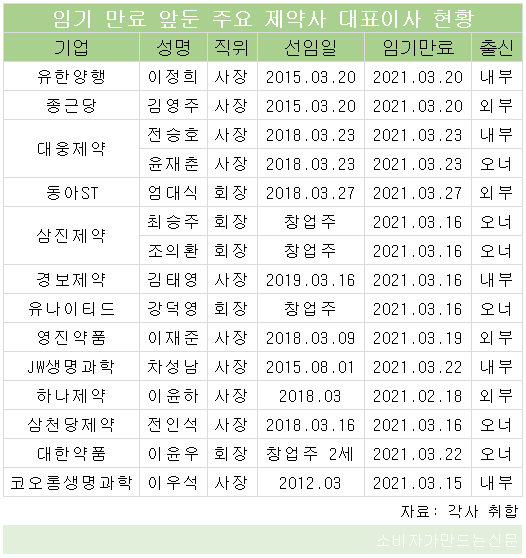 국내 30대 제약사 가운데 올해 3월 임기 만료되는 대표이사는 13개사에 총 15명에 달한다.