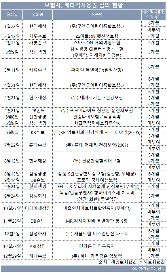 삼성화재 ‘독감(인플루엔자) 항바이러스제 치료비 특별약관’와 ‘재물보험 비즈앤안전 파트너’, KB손보 ‘암보험과 건강하게 사는 이야기’, 하나손보 ‘하나 가득담은 암보험’ 등도 배타적사용권 획득에 성공했다.
