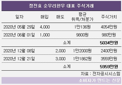 이후 정정공시가 있기 전인 지난해 12월 10일과 23일 각각 2000주, 3000주를 매도했다. 주당 평균 1만2000원, 1만1862원에 팔았다.