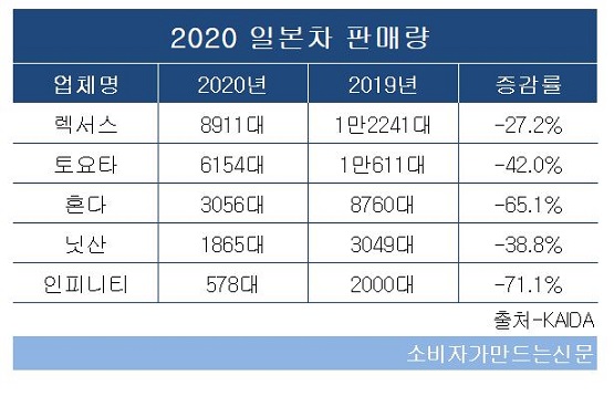 코로나19 여파에도 오히려 판매량이 늘어난 수입차 시장에서 일본차 브랜드만 모두 감소세를 피하지 못했다.