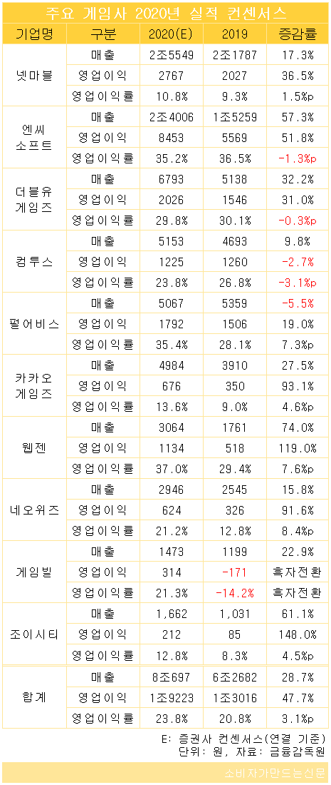 증권사들이 최근 한 달간 발표한 추정 실적치 평균값을 구한 결과 10대 상장 게임사의 지난해 매출은 8조697억 원으로 2019년 6조2682억 원보다 28.7% 증가할 것으로 집계됐다. 같은 기간 영업이익은 1조3016억 원에서 1조9226억 원으로 47.7% 늘어날 것으로 전망됐다.
