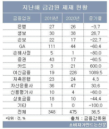 한편 지난해 금감원이 금융사에 내린 제재건수는 총 475건으로 전년 348건 대비 36.5% 급증했다. 지난해 12월 ‘소재지 불명’, ‘대부업자 변경 등록 의무 위반’ 등으로 대부업 200여 곳이 무더기로 적발되면서 제재건수가 크게 늘어난 것이다.