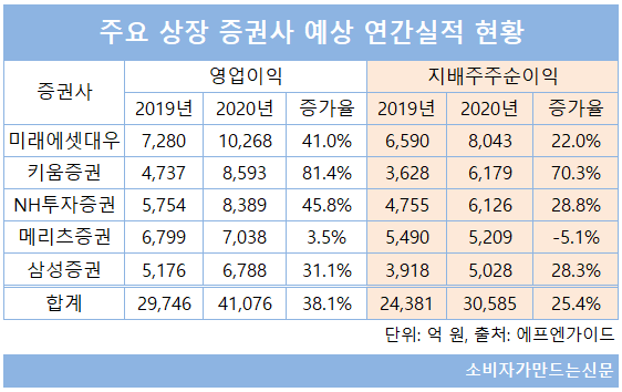 미래에셋대우(대표 최현만·조웅기)는 업계 최초로 '연간 영업이익 1조 원' 돌파가 유력하고 개인 브로커리지 1위 증권사인 키움증권(대표 이현)도 전년 대비 순이익이 70% 이상 급증할 것으로 예상된다.