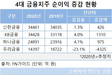 금융정보사이트 에프앤가이드에 따르면 4대 금융지주 가운데 우리금융을 제외한 3개사의 지난해 순이익이 전년보다 늘어날 것으로 전망된다.