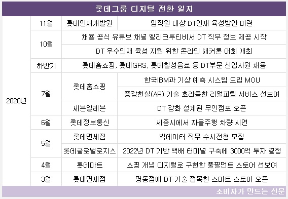 롯데그룹 관계자는 “신동빈 회장의 DT 강조 이후 첨단기술과 트렌드에 대한 정보 수집과 스터디를 진행하며 각 사별로 사업 특성에 맞는 디지털 전환을 추진하고 있다”며 “코로나19 이후 DT 인재 선발, 육성 등 본격적인 디지털 전환에 돌입했다”고 말했다.