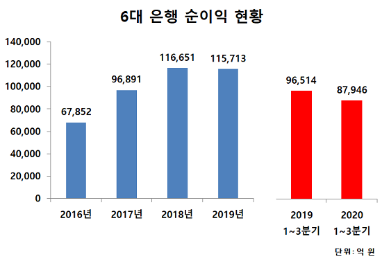 그러나 지난해 실적은 전년 대비 하향 곡선을 그렸다. 지난해 3분기 말 기준 6대은행(KB국민, 신한, 하나, 우리, 농협, 기업)의 누적순이익은 전년 대비 8.9% 감소한 8조7946억 원이었다.