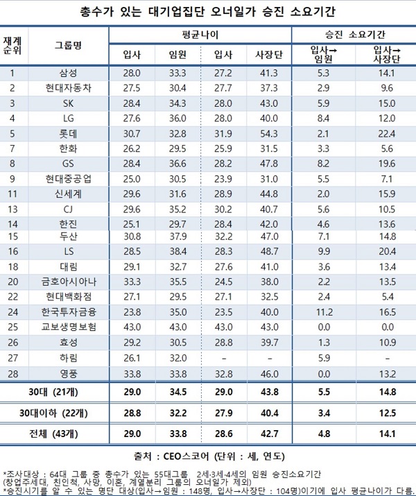 기업평가사이트 CEO스코어(대표 박주근)가 공정거래위원회 지정 64개 대기업집단 중 오너일가 부모 및 자녀 세대가 함께 경영에 참여하는 43개 그룹의 임원 승진 기간을 조사한 결과, 오너일가는 입사 평균 4.8년 만에 임원으로 승진한 것으로 13일 집계됐다.