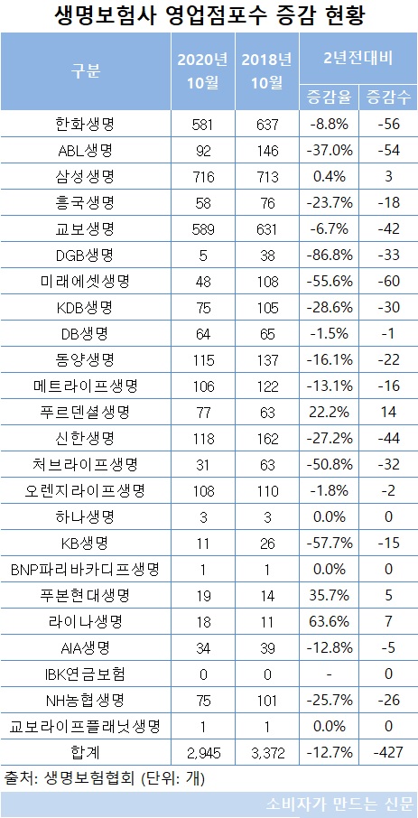 15일 생명보험협회에 따르면 지난해 10월 기준 국내 24개 생보사의 영업점포 수는 2945개로 2년 전 대비 427개(12.7%) 감소했다. 점포에는 영업본부, 지점, 영업소, 해외 등이 포함된다.