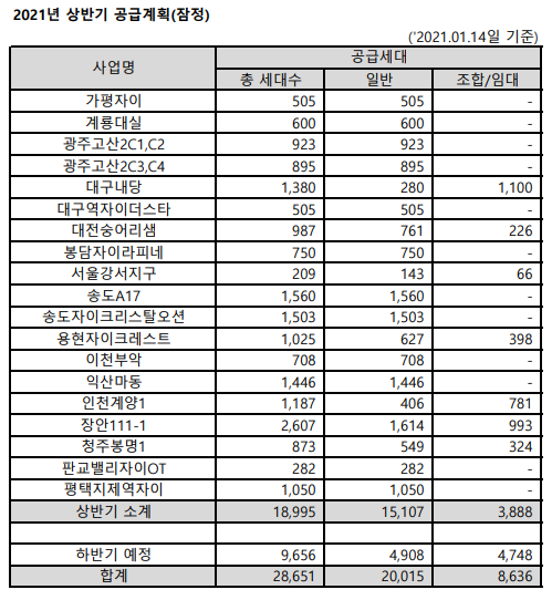 GS건설이 제공한 2021년 공급계획을 지역별로 보면 전체 물량 중 절반이 넘는 약 1만7600여 가구(61%)가 서울·수도권에 집중됐다. 이 중 서울은 약 4600여 가구(16%)다. 이 밖에 대구·부산·광주 등 지방에 1만1000여 가구(39%)를 공급한다.
