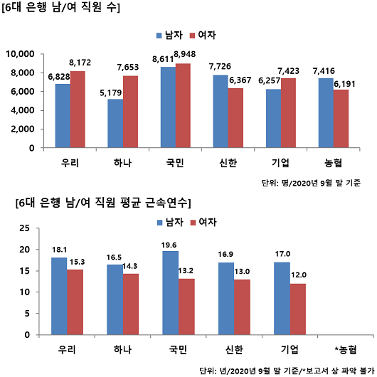 지난해 9월 말 기준 조사대상 6대 은행 중에서 신한은행과 NH농협은행을 제외한 4개 은행은 여성 직원 수가 더 많았는데, 특히 하나은행은 여성 직원수가 남성직원보다 약 2500여 명 더 많았다.
