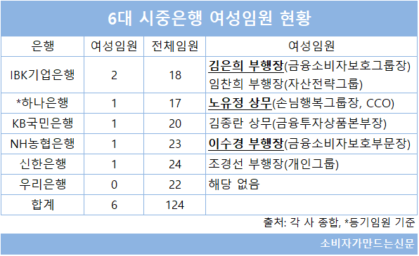 19일 기준 6대 시중은행의 상무 및 부행장 이상 임원 총 124명 가운데 여성임원은 6명으로 전체 임원의 4.8%에 그쳤다.