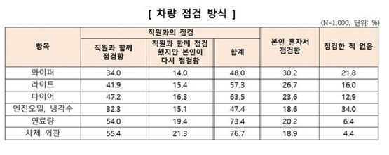 반면 엔진오일을 직원과 점검한 비율은 47.4%에 그쳤다. 와이퍼(48.0%), 라이트(57.3%)도 60%를 넘지 못했다.