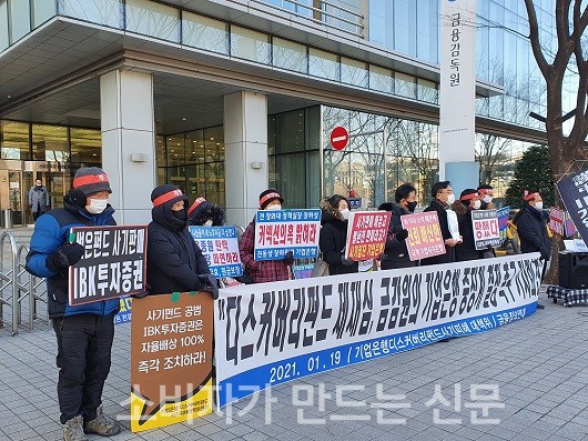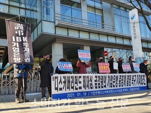 19일 오전 금감원 본원 앞에서 열린 집회에서 피해 투자자들은 기업은행에서 판매한 디스커버리펀드가 1년 9개월이 지나도록 환매절차가 진행되지 않고 있고 최근 사적화해를 요구했으나 이마저도 거절 당했다고 기업은행과 금융당국에 책임있는 자세를 요구했다.