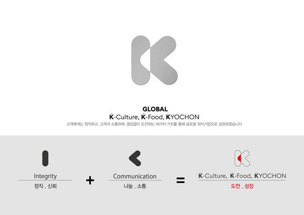 새로운 CI는 ‘K’ 이니셜을 심볼마크로 삼아 한국을 대표하는 글로벌 외식기업 도약의 의지를 표현했다. ‘K’ 이니셜은 교촌의 기업철학인 정직과 신뢰(Integrity)의 ‘I’와 나눔과 소통(Communication)을 뜻하는 ‘C’의 결합을 형상화했다. 시각적으로는 라운딩된 외곽라인을 통해 보다 직관적이고 부드러운 이미지를 전달한다.