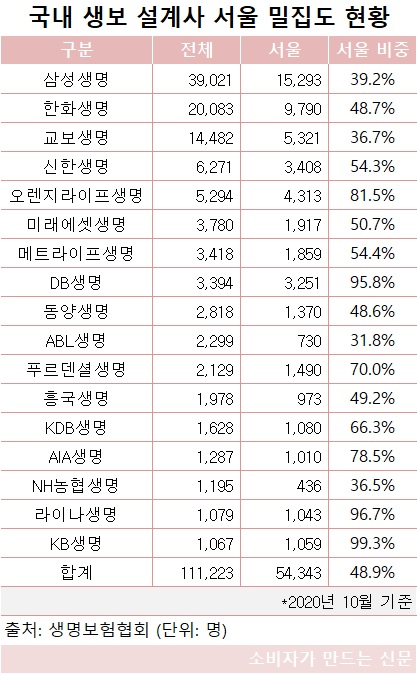 생명보험협회에 따르면 설계사 등록 인원이 1000명 이상인 17개 생보사의 설계사는 지난해 10월 기준 11만1223명으로 집계됐다. 이 가운데 48.9%에 달하는 5만4343명이 서울지역으로 등록됐다.