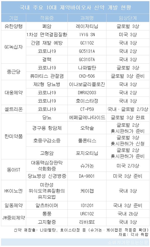 국내 제약사들의 신약 개발은 코오롱생명과학(대표 이우석)의 인보사케이주 성분 논란으로 한동안 침체 위기를 겪어왔으나 당뇨병 신약 제미글로·듀비에·슈가논, 위식도역류질환 신약 케이캡, 고혈압 신약 카나브 등이 블록버스터 의약품으로 선전하는 가운데 기대주였던 렉라자 허가로 회복 조짐을 보이고 있다.