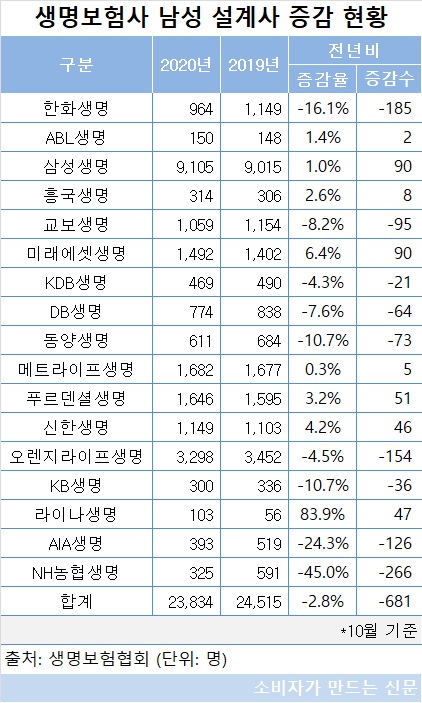 한 생명보험사 관계자는 “특히 외국계 생보사의 경우 화이트 칼라 이미지의 젊은 남성 설계사를 전략적으로 육성하는 분위기가 있었다”고 설명했다.
