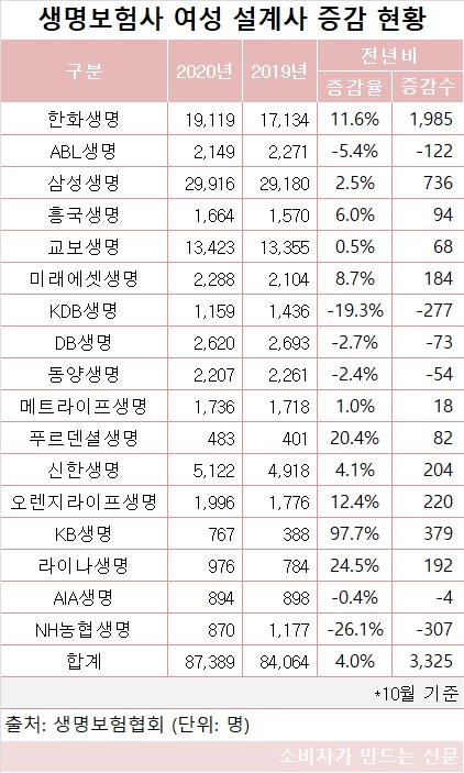 남성 설계사는 총 2만2834명으로 1년 전보다 2.8%(681명) 줄었고, 여성 설계사는 8만8380명으로 4%(3325명) 증가했다.