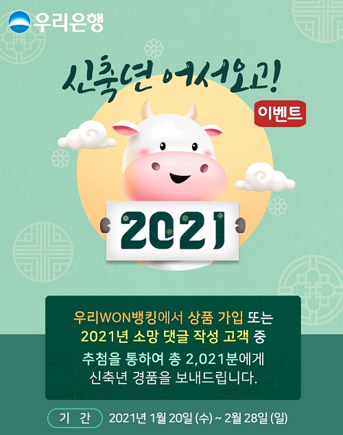 우리은행 관계자는 “2021년 신축년 새해를 맞아 희망찬 한해가 되길 바라는 마음으로 이번 이벤트를 준비했다”며 “앞으로도 고객들이 만족할 수 있는 언택트 서비스와 풍성한 혜택을 담은 이벤트를 제공할 것”이라고 말했다.