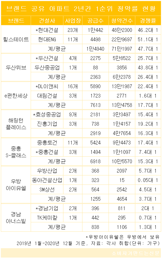 22일 한국감정원 청약홈에 따르면 2019년 1월부터 지난해 말까지 최근 2년간 브랜드를 소유한 시공사가 공급한 민간 아파트의 평균 1순위 청약 경쟁률은 54대 1를 기록했다. 같은 브랜드를 빌려 쓴 시공사의 평균 경쟁률은 27.7대 1로 큰 차이를 보였다.
