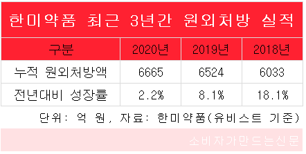 한미약품은 최근 6년간 기록을 합쳐도 가장 많은 원외처방액 성과를 이뤄냈다. 유비스트 기준으로 2015년부터 작년까지 6년간 총 3조3160억 원의 처방액을 달성해 국내외 제약사 중 1위를 차지했다.