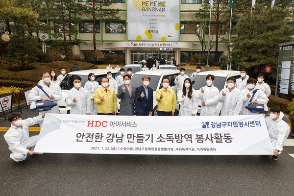 HDC아이서비스 본사가 위치한 강남구 일대의 장애인 공동생활가정, 사회복지기관, 지역아동센터, 수정마을 등 코로나19 감염에 취약한 40개소를 대상으로 진행된 이번 봉사활동에는 전문 소독요원을 비롯한 HDC아이서비스 임직원 30여 명이 참여했다.