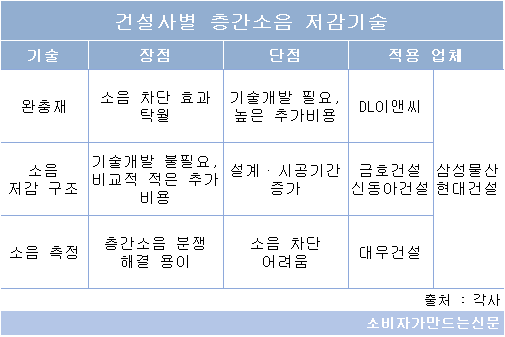 건설사별로 DL이앤씨·대우건설은 별도의 기술개발이 필요한 완충재, 소음 측정 기술에 집중하고 금호건설·신동아건설 등 중형건설사는 설계를 변경하기만 하면 되는 소음 저감 구조에 주력하고 있다. 삼성물산·현대건설 등 대형건설사는 3가지 기술을 모두 개발·적용하고 있다.