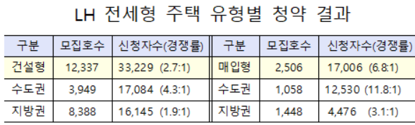 LH는 지난 18일부터 20일까지 3일간 건설형 1만2337가구, 매입형 2506가구 등 전국 1만4843가구의 전세형 주택에 대해 권역별 입주자를 모집했다. 총 5만235가구가 신청해 전국 평균 3.4대 1의 경쟁률로 청약을 마감했다.