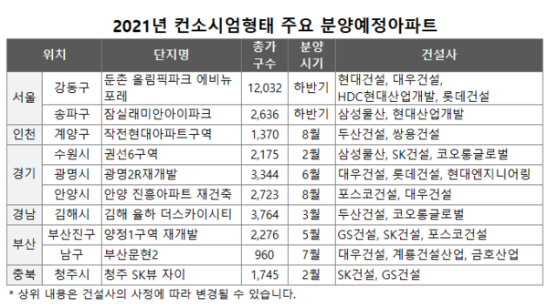 26일 아파트 분양평가업체 리얼하우스에 따르면 두산건설·코오롱글로벌 컨소시엄이 시공하는 '김해율하 더 스카이시티'를 비롯해 10여 개 이상의 컨소시엄 아파트 분양이 올해 진행될 예정이다.
