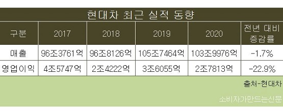 현대자동차는 지난해 매출 103조9976억 원, 영업이익 2조7813억 원을 기록했다고 26일 밝혔다. 전년 대비 매출은 1.7%, 영업이익은 22.9% 줄어든 수치다.