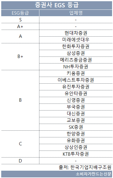 한국기업지배구조원이 국내 증권사 19곳의 ESG 항목을 분석한 결과 종합등급 S 또는 A+를 받은 곳이 단 한 곳도 없었다.