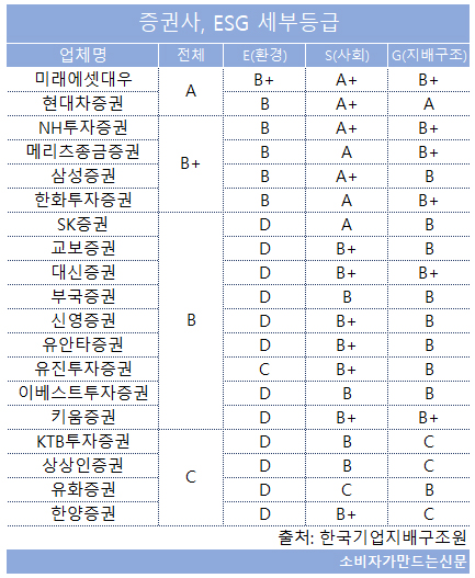 증권사들은 사회 항목에서는 A+에서부터 B+까지 대부분 좋은 등급을 받았지만 지배구조는 ‘보통’에 해당하는 B등급을 받은 곳이 많았으며 특히 환경 항목에서 낮은 등급을 받았다.