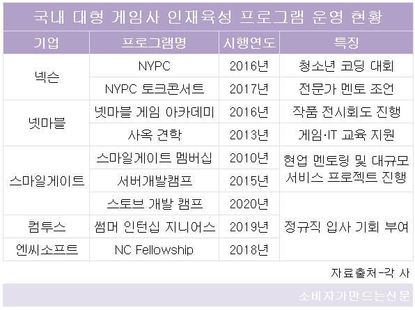 게임 아카데미는 청소년을 대상으로 실무 중심의 개발과정 교육을 8여개월간 제공해 자신만의 게임을 만들 기회를 제공하는 인재 육성 프로그램이다. 게임 경진대회를 통해 참가자들이 제작한 작품 중 우수작을 시상하고 전시회를 통해 공개한다.