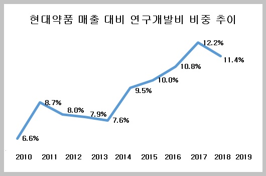 이 대표가 R&D를 총괄한 이후 현대약품의 매출 대비 연구비 비중은 10% 이상으로 확실하게 자리 잡았다. 2010년대 초반 7%대였던 매출 대비 연구비 비중은 2018년 12.2%, 2019년 11.4%로 높아졌다.