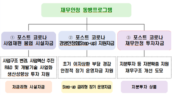 마지막으로 '포스트 코로나 재무안정 투자자금'은 부채비율 증가 등으로 재무안정 수요가 있는 기업을 대상으로 산업은행이 주식 및 주식 관련채(상환우선주, 전환사채 등) 매입을 통해 자본확충 및 금융비용 경감 등을 통한 재무안정을 지원하는 투자 상품이다.