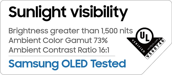 UL은 평가를 위해 디스플레이의 야외 시인성에 영향을 주는 색영역과 휘도 등을 측정했다. 그 결과 삼성 OLED는 '밝은 환경에서의 색영역'이 DCI-P3 기준 73%를 충족했으며 최고 휘도는 1500nit(니트) 이상으로 나타났다.