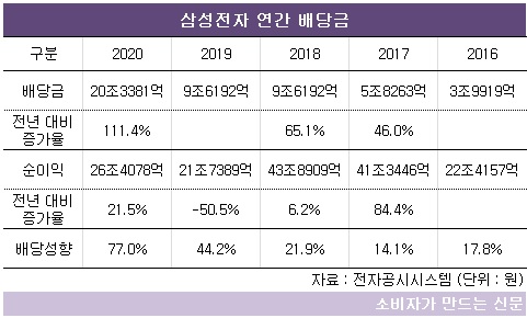 삼성전자의 배당 확대는 주주환원 정책에 따른 결과로, 2017년부터 2020년까지 총 배당금은 45조4029억 원에 달한다.