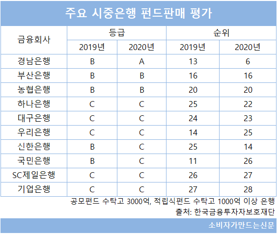 실제로 판매단계에서 은행의 전문성 부재는 여러 연구결과에서도 나타나고 있다. 한국금융투자자보호재단이 최근 발표한 주요 펀드 판매회사 평가 결과에 따르면 조사대상 은행 10곳 중 A~B등급을 받은 곳은 경남은행과 부산은행, 농협은행 등 3곳에 불과했다. 하위등급인 C등급에는 하나은행, 신한은행, 국민은행, 기업은행 등 대형 시중은행 다수가 이름을 올렸다.