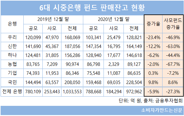 특히 금융위원회로부터 지난해 일부 영업정지 징계를 받은 우리은행과 하나은행의 사모펀드 판매잔고가 현격하게 줄었다.
