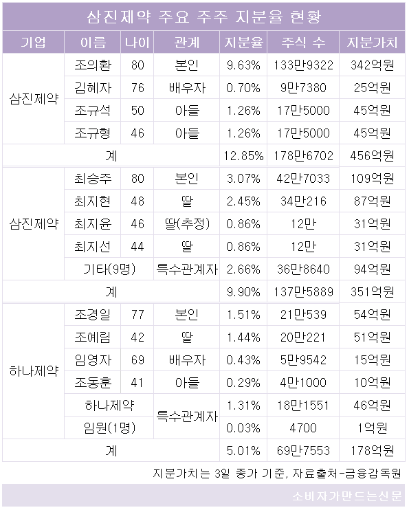 이로써 삼진제약은 △삼진제약 조의환 회장 직계 오너일가(12.85%, 지분가치 456억 원) △삼진제약 최승주 회장 직계 오너일가(9.9%, 지분가치 351억 원) △하나제약 조경일 명예회장 직계 오너일가(5.01%, 지분가치 178억 원)로 삼강 구도가 구축됐다.