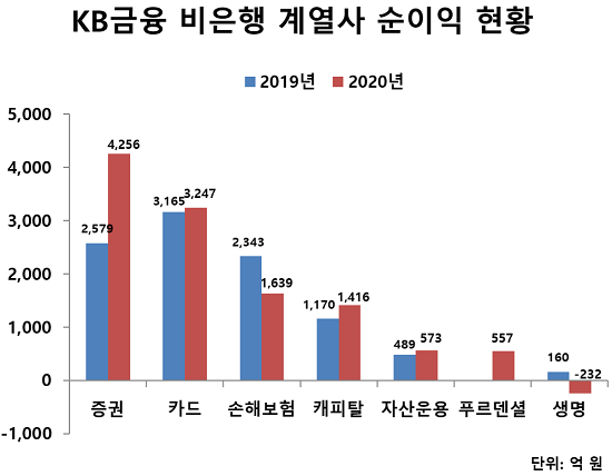 보험 계열사의 경우 지난해 하반기 푸르덴셜생명(대표 민기식)이 그룹으로 편입했지만 KB손해보험(대표 김기환)과 KB생명(대표 허정수)이 동반 부진했다.
