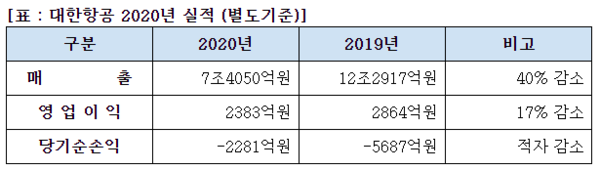 4일 대한항공은 2020년 잠정 영업실적을 공시하며 매출 7조4050억 원, 영업이익 2383억 원, 당기순손실 2281억 원을 기록했다고 밝혔다.
