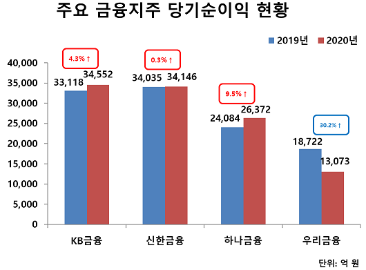 개별 지주사로는 KB금융지주가 전년 대비 4.3% 증가한 3조4452억 원의 순이익을 거두며 1등 금융지주사 타이틀을 가져갔고 신한금융지주는 같은 기간 0.3% 증가한 3조4136억 원을 기록하며 근소한 차이로 2위를 달성했다.