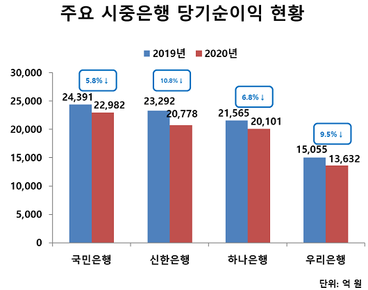 다만 증권·보험계열사가 없는 우리금융은 비은행 포트폴리오의 취약점을 드러냈고 코로나19로 인한 선제적 대응 차원에서 충당금을 추가로 적립하면서 전년 대비 큰 폭으로 수익성이 악화되면서 아쉬운 성적표를 받게 되었다.