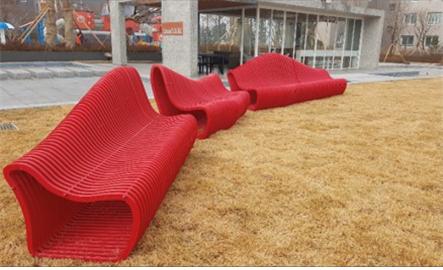 현대건설은 지난해 입주한 ‘힐스테이트 레이크 송도 2차’에서 국내 최초로 비정형 조경구조물인 옥외용 벤치를 제작했다. 각기 다른 형상으로 이뤄진 약 200개 부재를 3D프린팅으로 적층·가공해 제작했다는 설명이다.