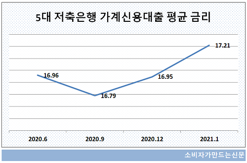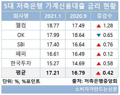 10일 저축은행중앙회에 따르면 자산규모 기준 상위 5대 저축은행인 SBI저축은행, OK저축은행, 페퍼저축은행, 한국투자저축은행, 웰컴저축은행의 평균 가계신용대출금리는 지난해 9월부터 꾸준히 상승하며 17.21%를 기록했다.