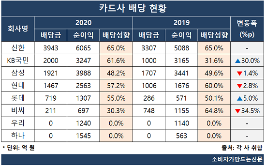 신한카드와 KB국민카드는 배당성향이 60%를 넘겼고, 현대카드와 롯데카드는 55% 이상을 기록했다. 또 삼성카드도 50%에 육박하는 수준을 보였다. 비씨카드만 유일하게 30%에 머물렀다.