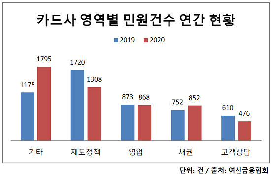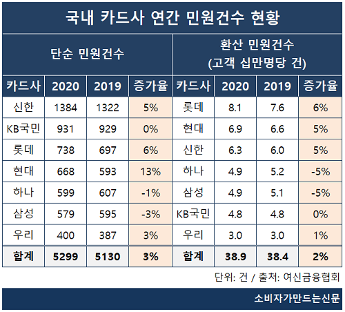 18일 여신금융협회에 따르면 지난해 전체 카드사 민원 건수는 5299건으로 전년 5130건 보다 169건(3%) 늘었다. 고객 10만명당 환산건수도 38.9건으로 전년 38.4건 대비 2% 증가했다.